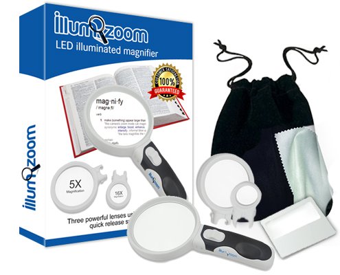 - Product Name: BEST-Magnifying Glass with LED Light, Handheld Portable Magnification with Glas Illuminated Heads. 2.5x, 5x, 16x BONUS Credit Card Size Magnifier, Carry Bag, and Cleaning Cloth by Illumizoom